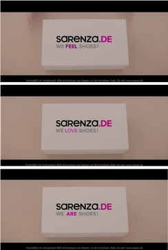 Der Branding-Shot am Schluss: ein SARENZA Schuhkarton mit wechselnden Marken-Statements.