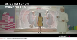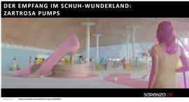 Eine Welt, die in Schuhen tickt: die Treppe ist ein riesiger pinkfarbener Pumps, der Telefonhörer hat die Form eines weißen Highheels. Junge, meist stylische Frauen gehen verschiedenen Aufgaben nach: sie testen Schuhe auf dem Laufband in einem gläsernen Raum, begutachten Schuhe am Tablet oder an einem Konfi-Tisch, nehmen Bestellungen telefonisch an, verpacken liebevoll Schuhe in pinkfarbene oder weiße Kartons, die sie dann mit gezieltem Wurf aus einem blauen Himmel